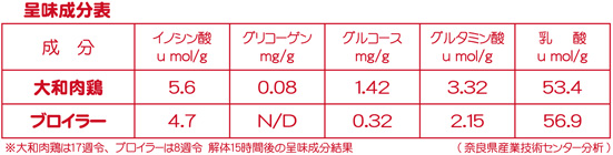 「名古屋種」「ニューハンブシャー種」「シャモ」の三品種を掛け合わせ、改良を重ねた結果、コクと旨味があり、肉の締まりがよく、適度な脂肪がある肉鶏の作出に成功し、昭和57年に「大和肉鶏」と命名し、本県の代表的な特産品の1つにあげられてます。
